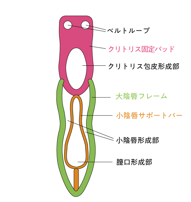 特にクリトリス固定パッドのクリトリス包皮形成部は薄いので包皮を傷つけないように必ず穴の淵に保護テープを貼ってご使用ください。