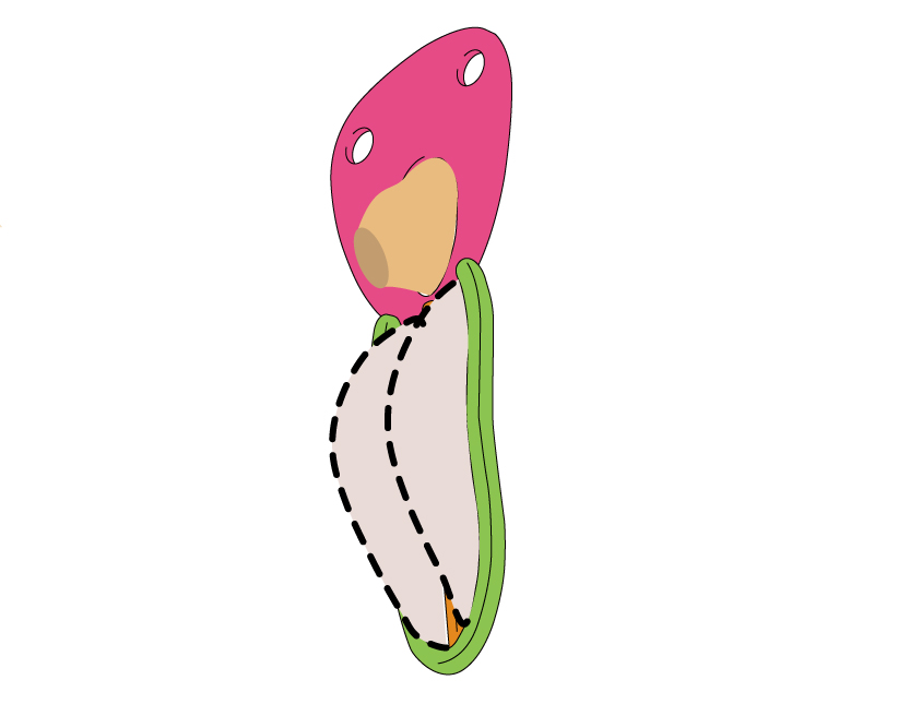 ①ペニスはそのままにして、先ず左の陰嚢の皮だけを大陰唇フレームと小陰唇サポートバーの隙間から多めに引張り出してください。