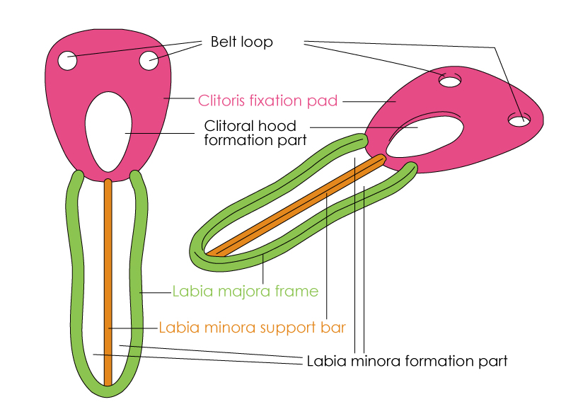 特にクリトリス固定パッドのクリトリス包皮形成部は薄いので包皮を傷つけないように必ず穴の淵に保護テープを貼ってご使用ください。