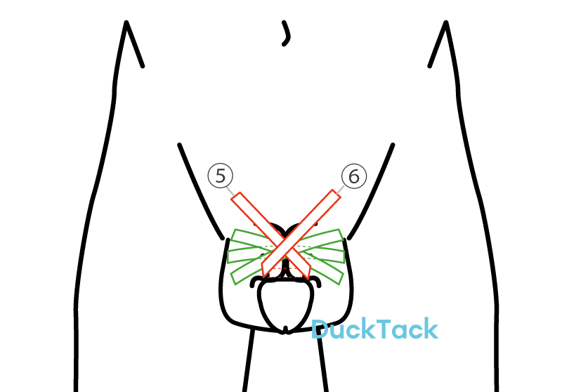 亀頭より根元側1cm位残した位置で亀頭下に巻いてあったテープ①をクロスした状態で鼠径部へ⑤⑥のように貼ります。